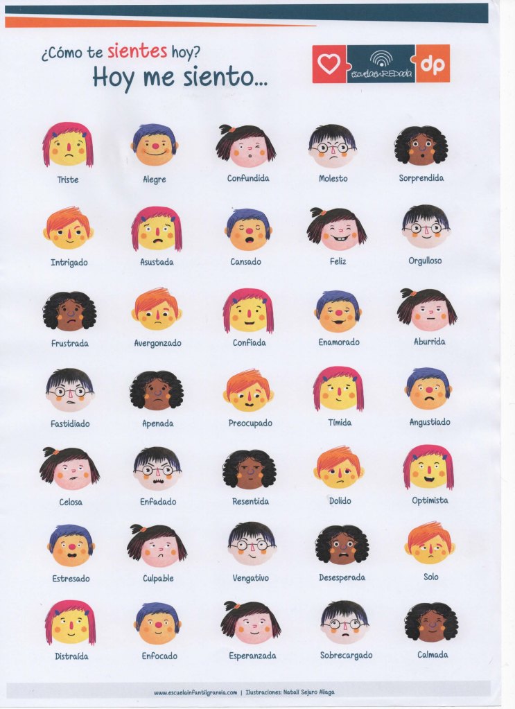 Este día nuestra sesión fue interesantísima, ambas aprendimos a nombrar, identificar algunas de las emociones más comunes, hablamos de la posibilidad de transformar el “¿Qué tal?” o el “¿cómo estás?” por la pregunta directa ¿CÓMO TE SIENTES HOY…?  y Ane se llevó una foto del cartel.